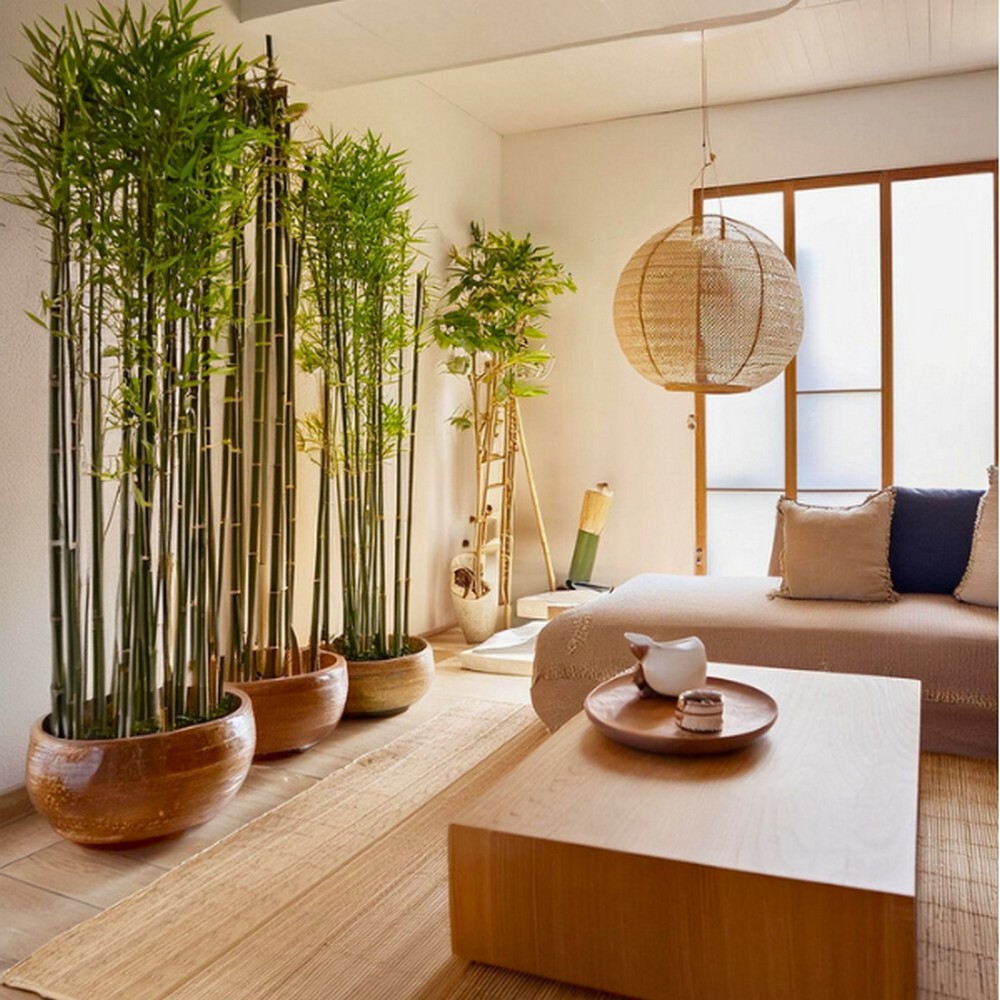 Bamboo accents seamlessly blend elegance with sustainability, a hallmark in Japandi living room designs. This natural material enhances the space’s clean aesthetics by adding a touch of organic charm and texture. It is widely used in both functional elements, like furniture, and decorative details. Supporting the minimalist yet warm environment characteristic of Japandi interiors.